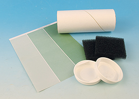 Sisältää tulpat, vaahtomuovin ja vihreän pahviputken
