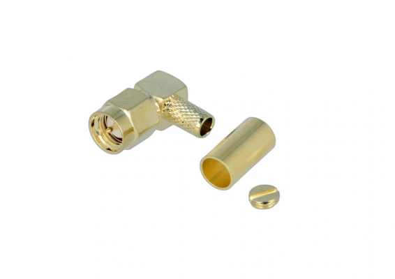 Puristettava SMA-uros kulma, RG-58 kaapelille.