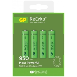 Ladattu 950 mAh AAA NiMH-akku. Koko Ø 10,5 x 44,5 mm. Heti käyttövalmis. Lataus säilyy yli vuoden ajan (85 %). 4 kpl/pakkaus.